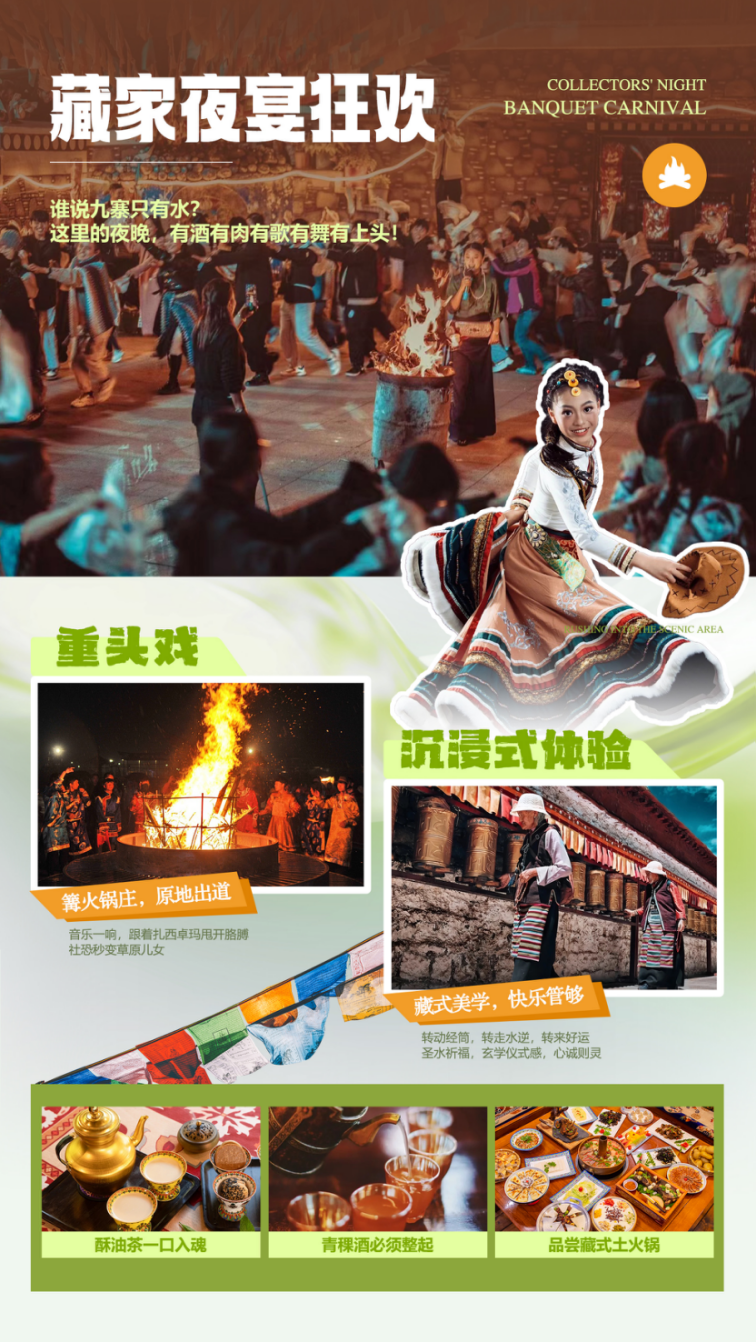 如提前含/或者参加《千古情晚会》《九寨沟藏羌风情晚会》的游客,统一前往九寨沟观看演出(晚会时间约 1小时,晚会为旅行社提前订票,不去费用不退,且不做等价置换),九寨沟藏羌风情歌舞晚会给 九寨沟无与伦比的自然景观增添了更丰富的文化内涵,成为九寨沟独具魅力的人文景观,是九寨沟完整游 程中不可缺少的组成部分,后乘车返回酒店休息。