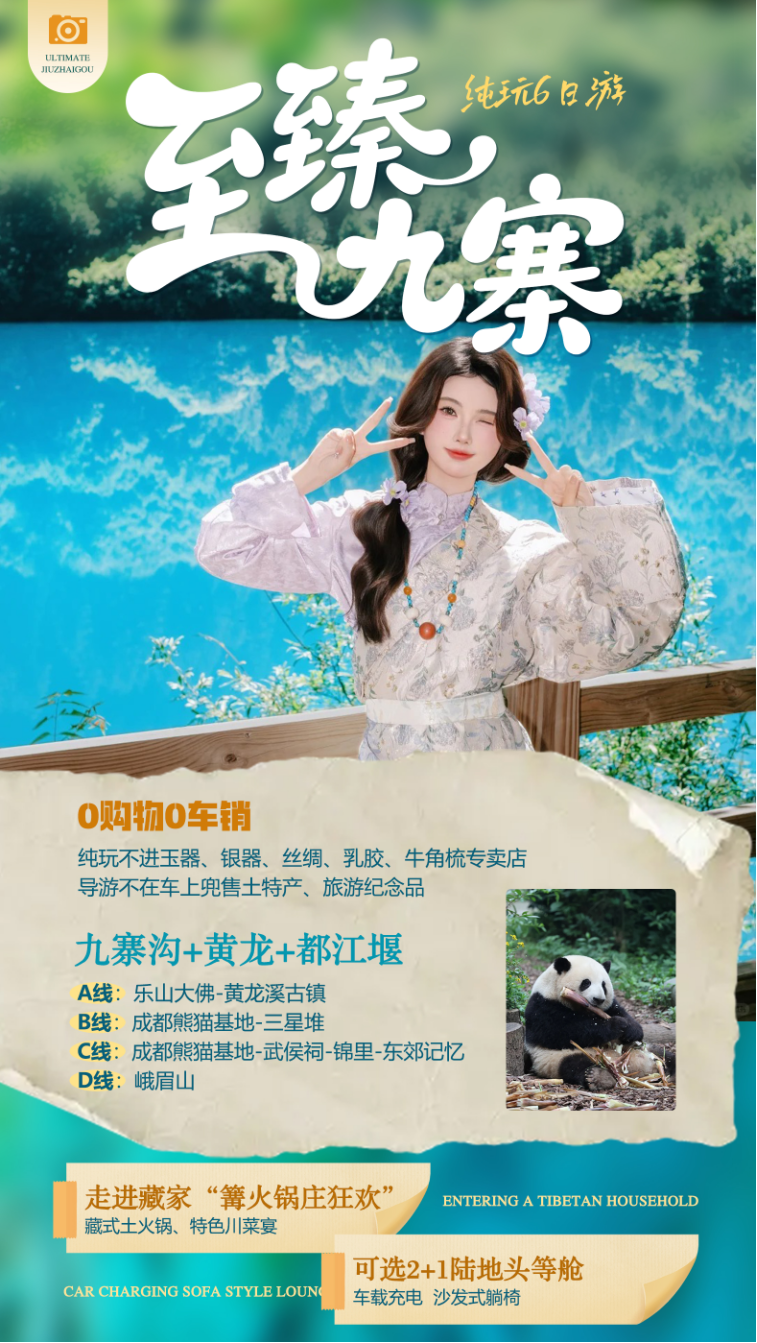 【精华景点】:九寨沟、黄龙、都江堰 +周边 5A景区一网打尽