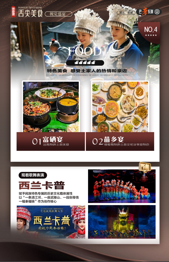 后前往中化中心观看歌舞表演,整场大秀以“西兰卡普”为主线,赋予民族特色专属的历史文化载体属性,以“一条清江河、一座武陵山、一段刻骨情、一幅幸福锦”作为创作核心,通过演绎以土家族为代表的各民族兄弟,用真心和真情化作金丝银线,共同编织美好幸福生活的精彩故事,表达了土家人民热爱家乡、崇尚自然、勤劳热忱的情怀,同时也体现了他们对家乡民族文化遗产、绿水青山的执着守望。(西兰卡普表演如周一休息调整观看时间)