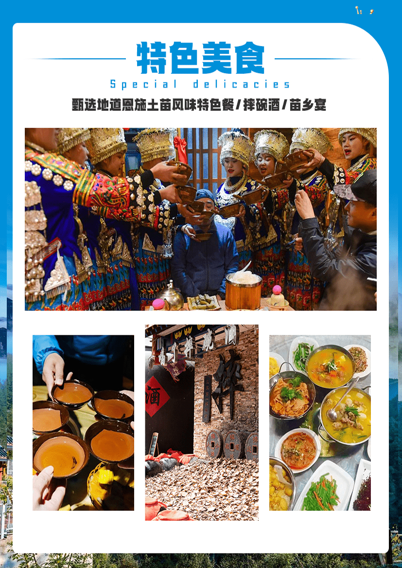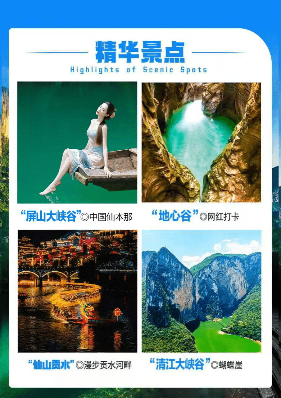 (温馨提示:女儿城表演以景区实际安排为准,若遇下雨等情况无法表演,敬请谅解,无法退任何费用;自由活动时间,请保管好随身携带物品、尊重当地民俗面貌注意人自身安全;景区内土家特色物品自愿收藏,不属旅行社购物,请谨慎消费)