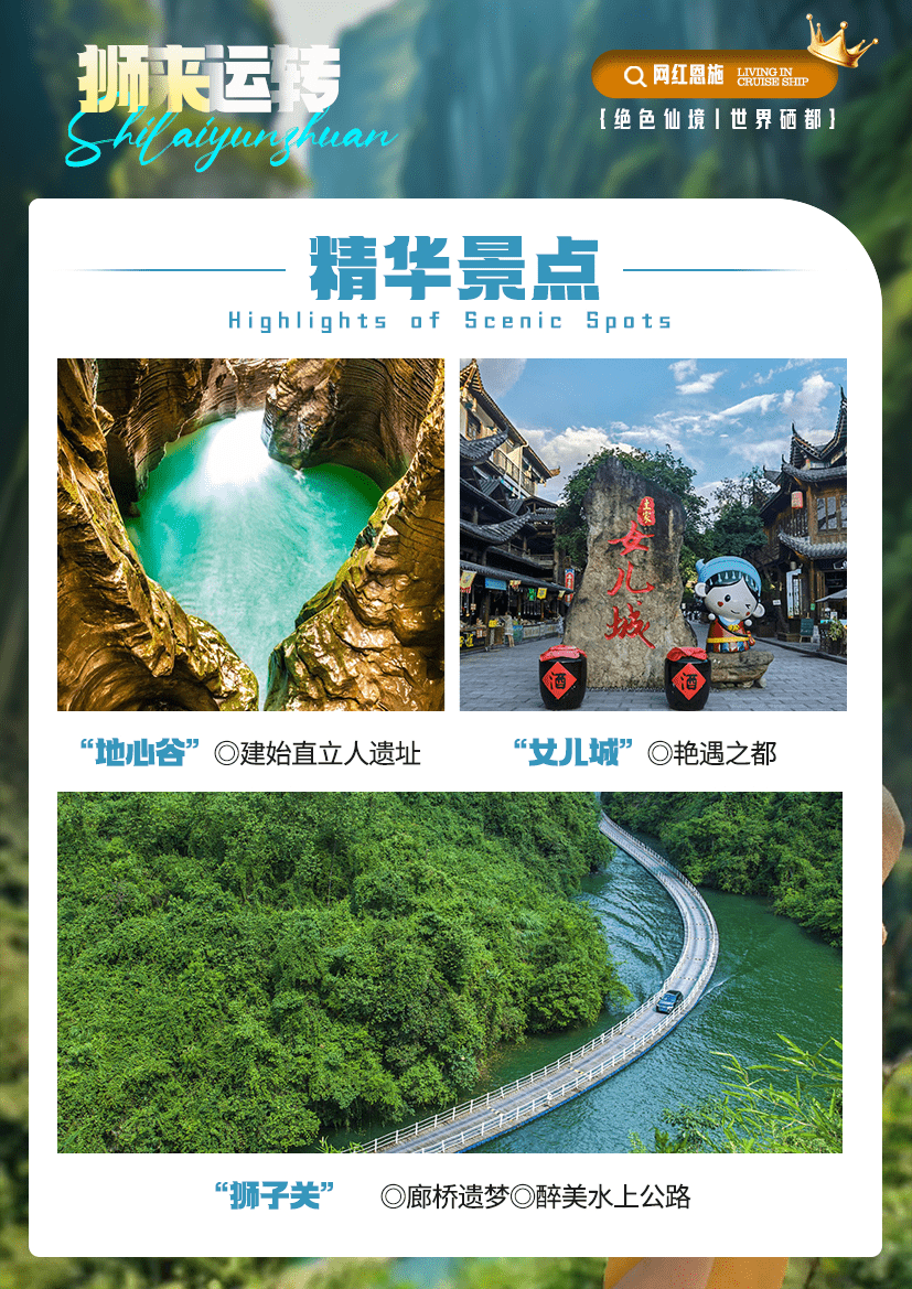 自费套餐:499元/人(包含恩施大峡谷景交+地面缆车+清江蝴蝶岩船票+地心谷景交+狮子关景交+车导综合服务费)