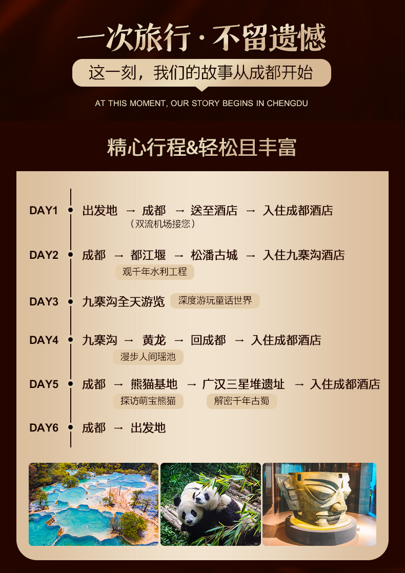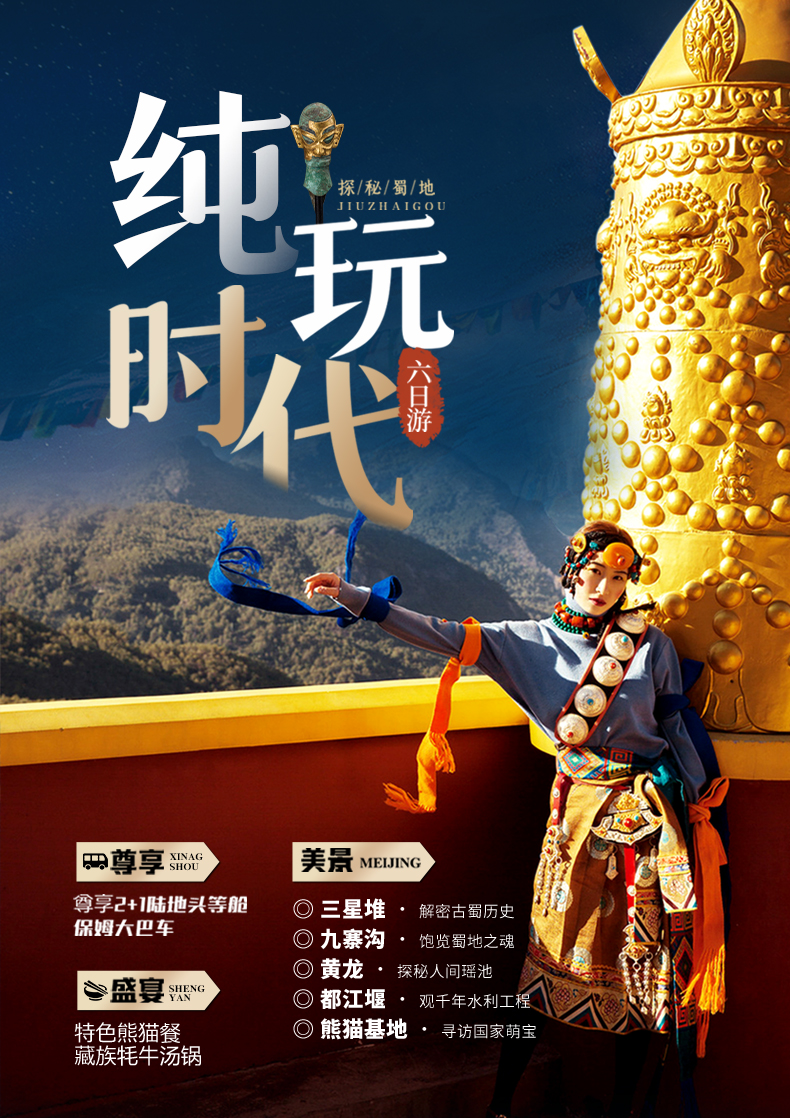 童话世界九寨沟/人间瑶池黄龙/国宝萌宠大熊猫/千年水利都江堰/三星堆博物馆