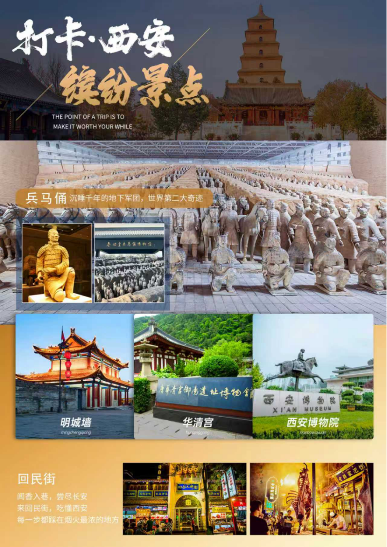 后游览西安市中心【钟鼓楼广场】西安著名的坊上美食文化街区【回民街】钟鼓楼广场又叫尚书省广场 ,位于东西南北四条大街的交汇处,面积达 6 万平方米,仅次于北京的天安门广场。广场东侧为有着600多年历史的钟楼,西侧为全国最大的鼓楼。20世纪90年代末,钟鼓楼广场建成后,钟楼和鼓楼得以相视而望。回民街不只是一条街,是西安市中心回民聚集区内多条街道的统称,由北院门、北广济街、西羊市、大皮院等街道组成。这里是西安小吃的集中地,作为几百年历史的回民区,这里还能感受到浓浓的穆斯林气息。结束后,根据客人航班/高铁时间安排专车送机/送站