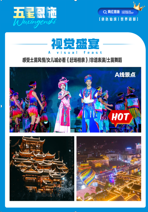 (温馨提示:女儿城表演以景区实际安排为准,若遇下雨等情况无法表演,敬请谅解,无法退任何费用;自由活动时间,请保管好随身携带物品、尊重当地民俗面貌注意人自身安全;景区内土家特色物品自愿收藏,不属旅行社购物,请谨慎消费)