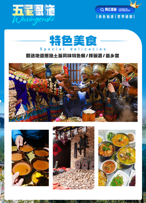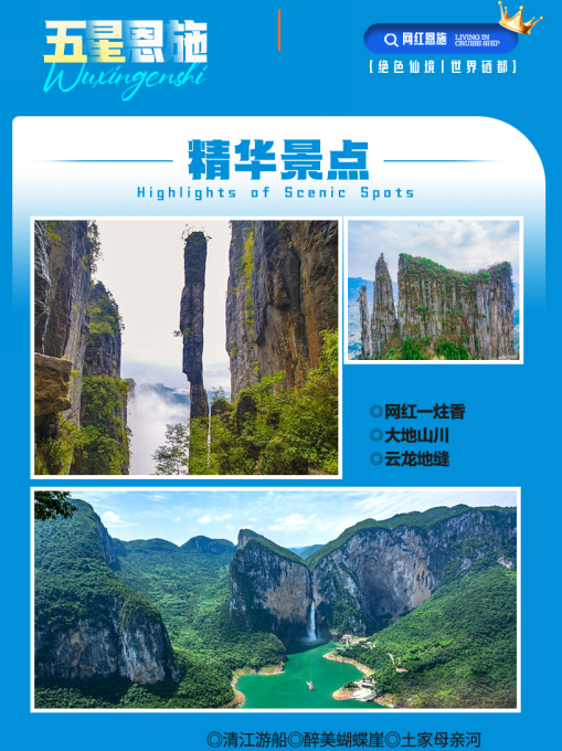 3、恩施精华景点一网打尽—建始地心谷/恩施5A大峡谷七星寨/清江蝴蝶岩/蝶舞清江.云顶/土家女儿城/仙山贡水6日游