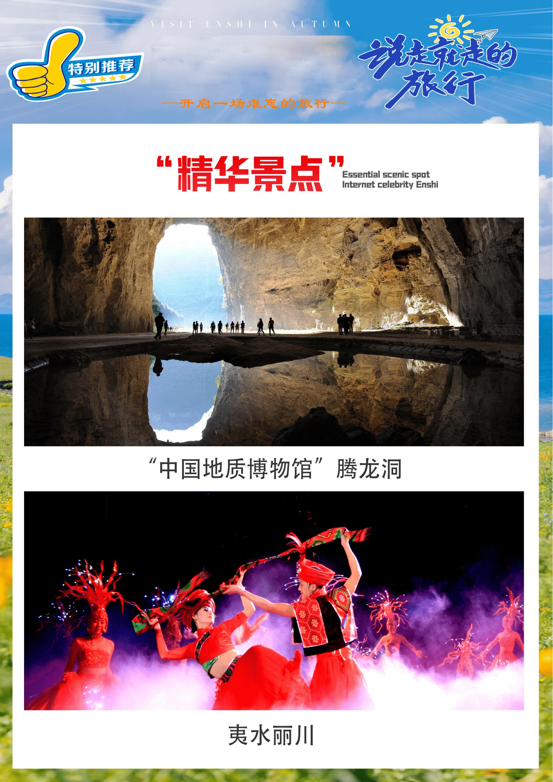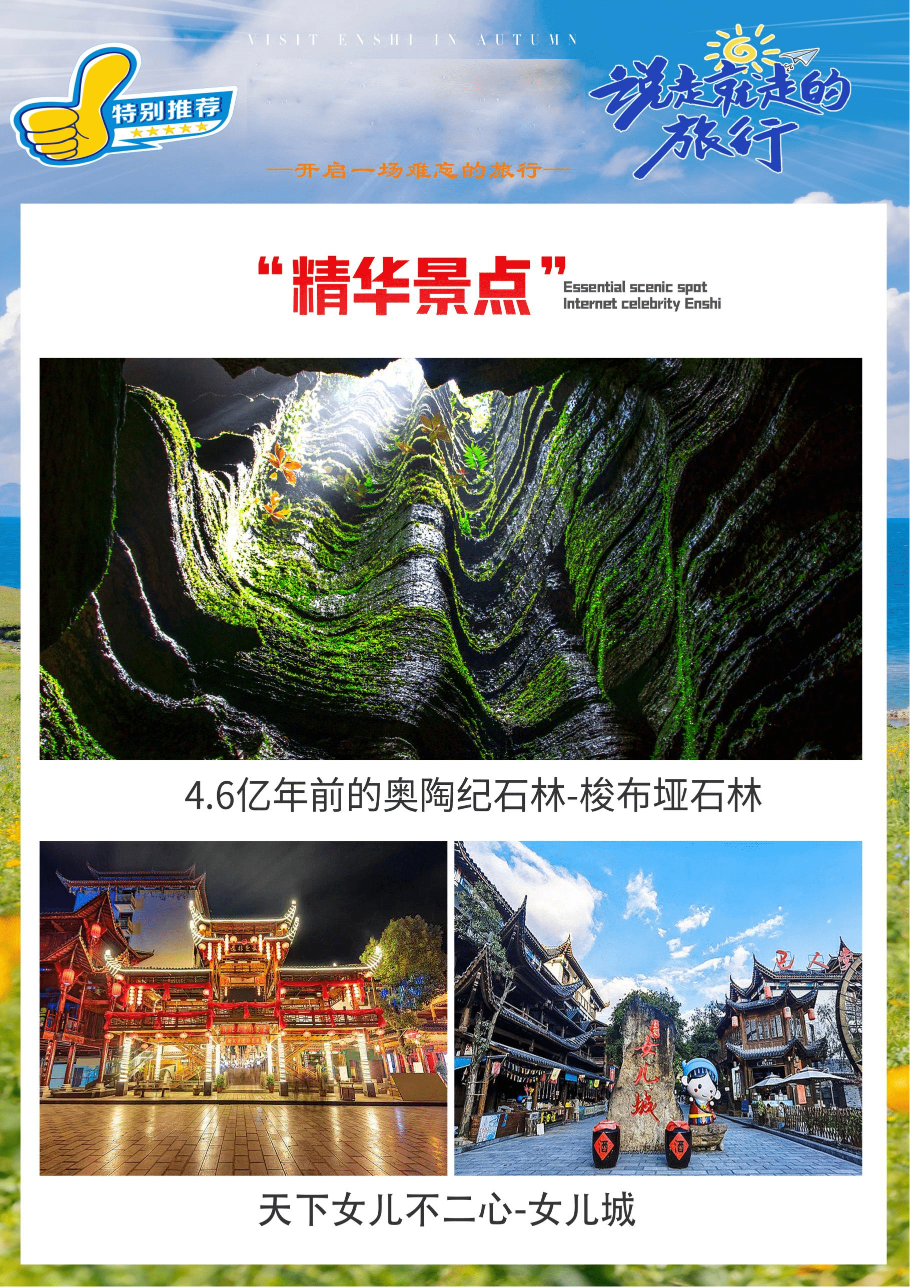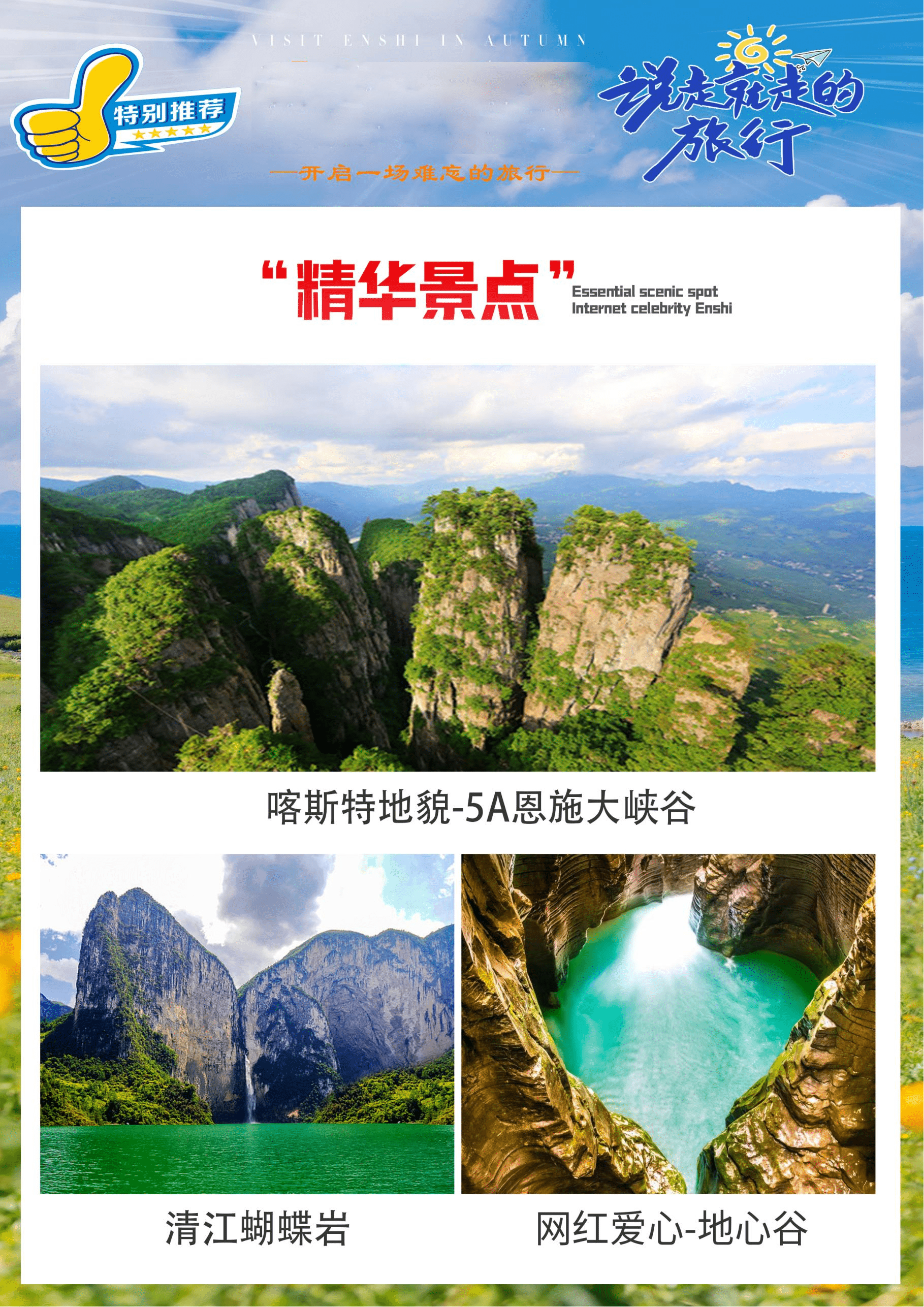3、恩施精华景点等你来探索—恩施5A景区大峡谷七星寨/建始地心谷/蝶舞清江.云顶/土家女儿城/清江蝴蝶岩/利川腾龙洞