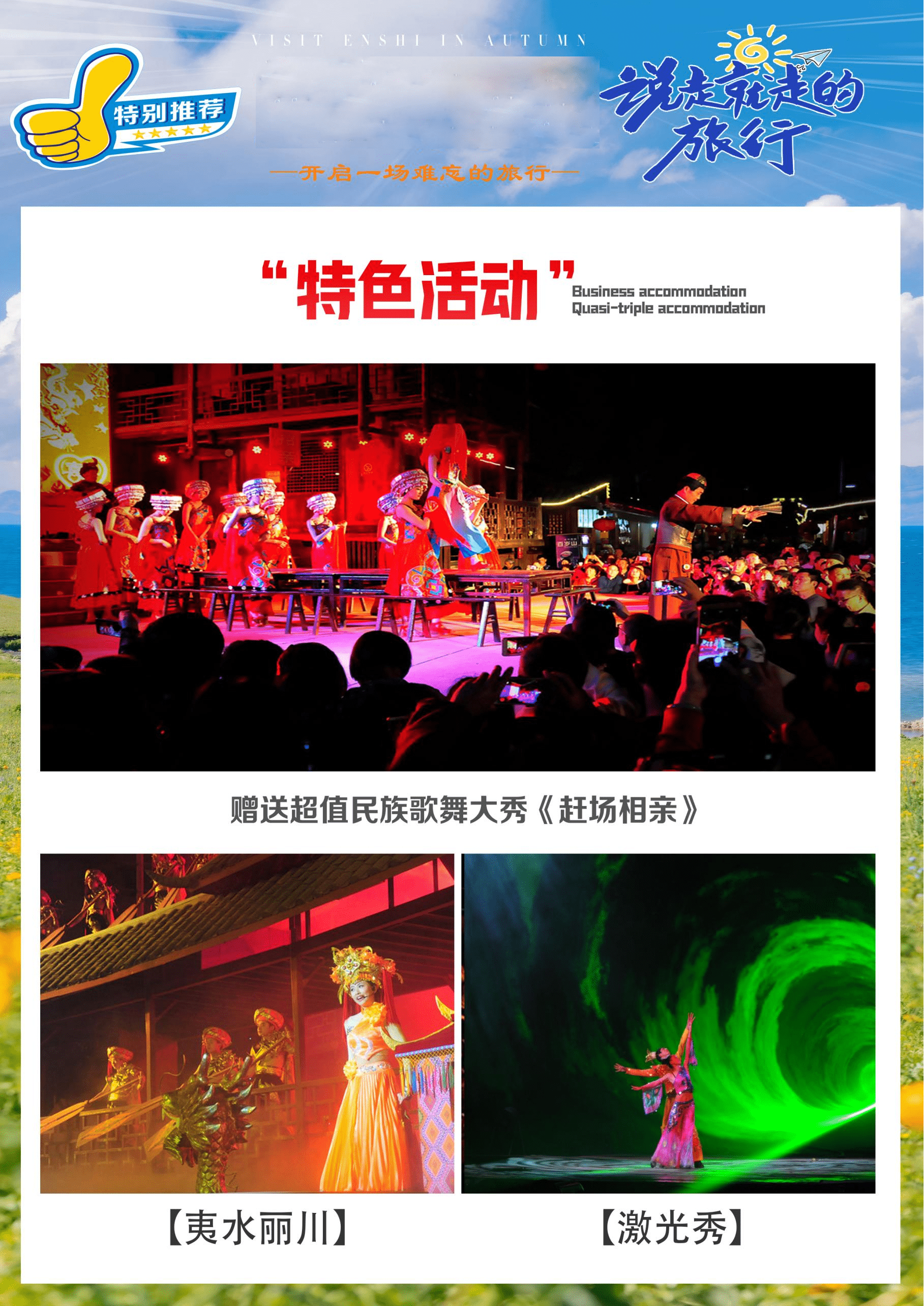 8、恩施地为少数名族聚集地,请尊重当地个人信仰和风情文化及风俗习惯。峡谷内有些地方有积水,注意不要嬉戏打闹,请做好防滑、有水滴落的准备。女儿城婚嫁表演秀由女儿城特别演出,如遇下雨等其他因素不能举行,则取消活动,游客不得以此投诉。