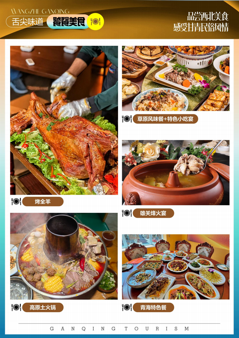 【美食鉴赏】:带您品尝西北味道,高原风情餐、特色小吃宴、雄关烽火宴、烤全羊、青海特色餐、青海土火锅等特色美食;生活的诗意,藏在三餐四季里,一粥一饭,都是烟火人间的温暖;