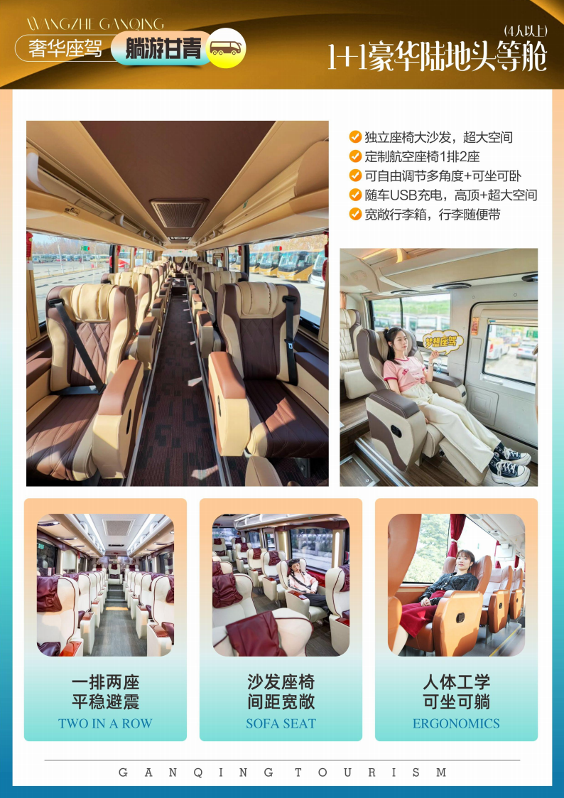 【尊享座驾升级】:满 4 人升级豪华 1+1 商务车,定制商务独立座椅+可自由调节多角度+可坐可卧,随车 SUB充电,高顶+超大空间,宽敞行李箱-行李随便带。西北那么累,躺游不受罪,西北旅游新风尚;