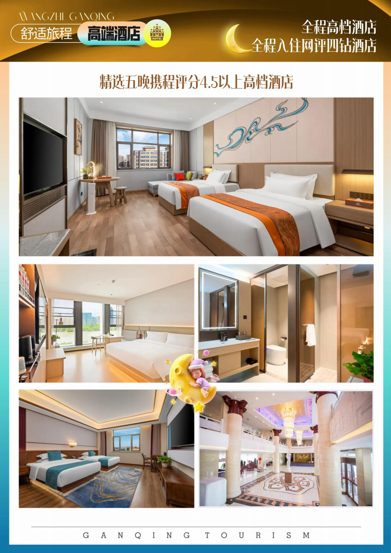 2、住宿:7 晚携程四钻酒店,其中 5 晚安排携程评分 4.5 分以上酒店;全程不提供单人间或三人间,遇单需补单房差;