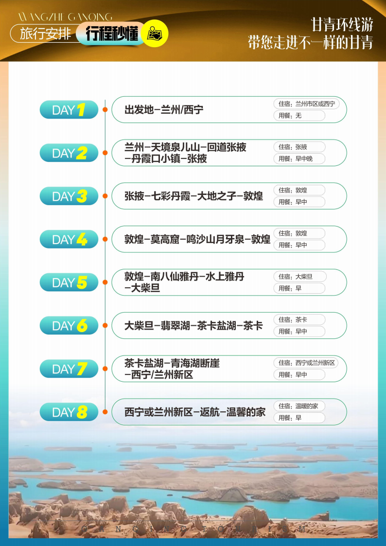 1、此天因为敦煌/兰州的火车,抵达兰州的时间最晚是 9:15 分的火车,兰州市区距离机场 80 公里,车程 1.5-2 小时,所以建议各位团友此天返程的时间请选择在 14:00 以后的飞机返程!