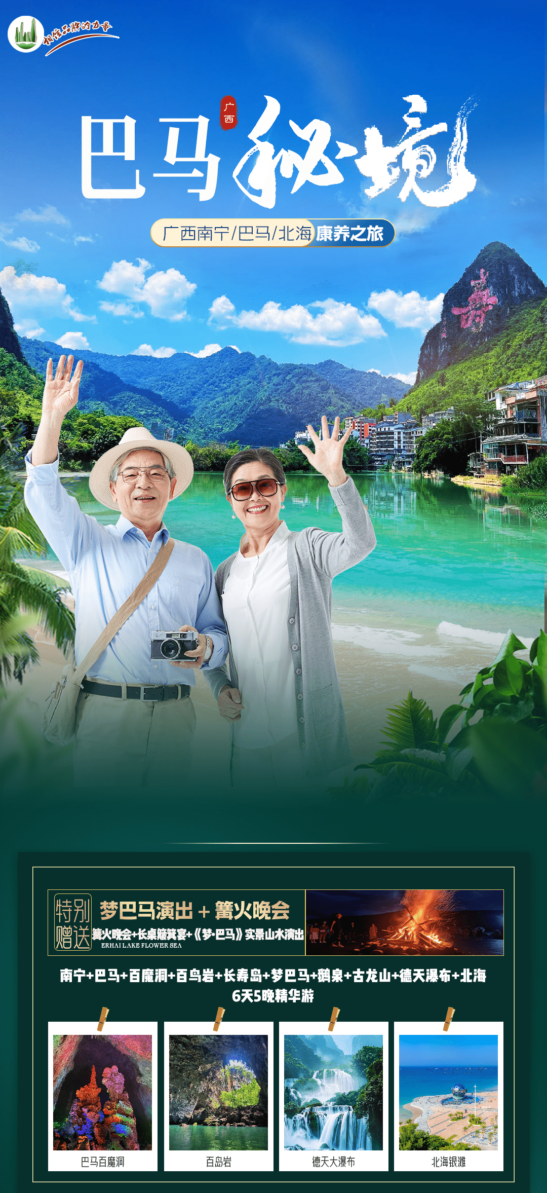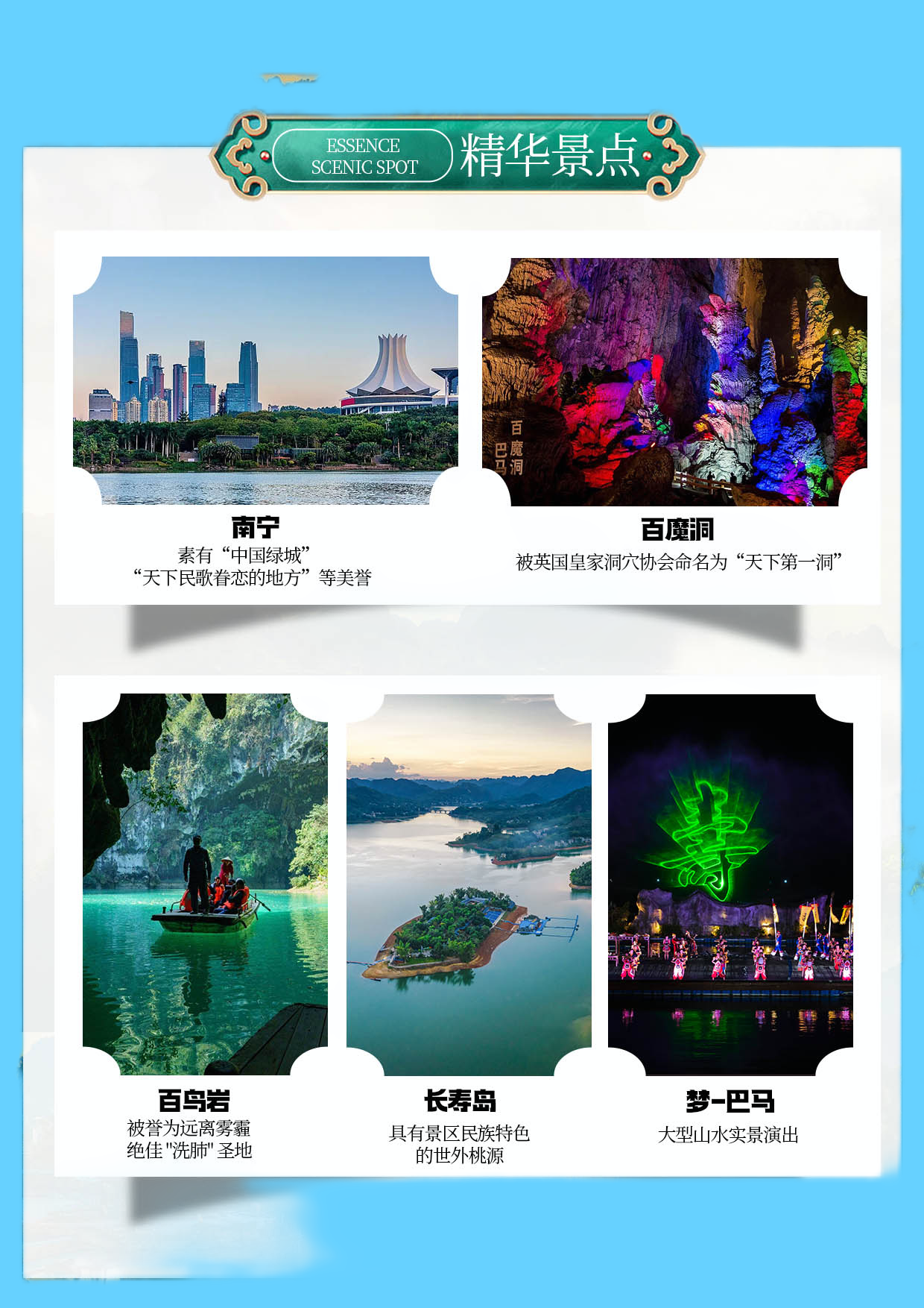 D2 | 南宁Ø巴马Ø百魔洞Ø百鸟岩Ø长寿岛Ø赠送梦巴马晚会 | √ | √ | √ | 巴马/百色 |