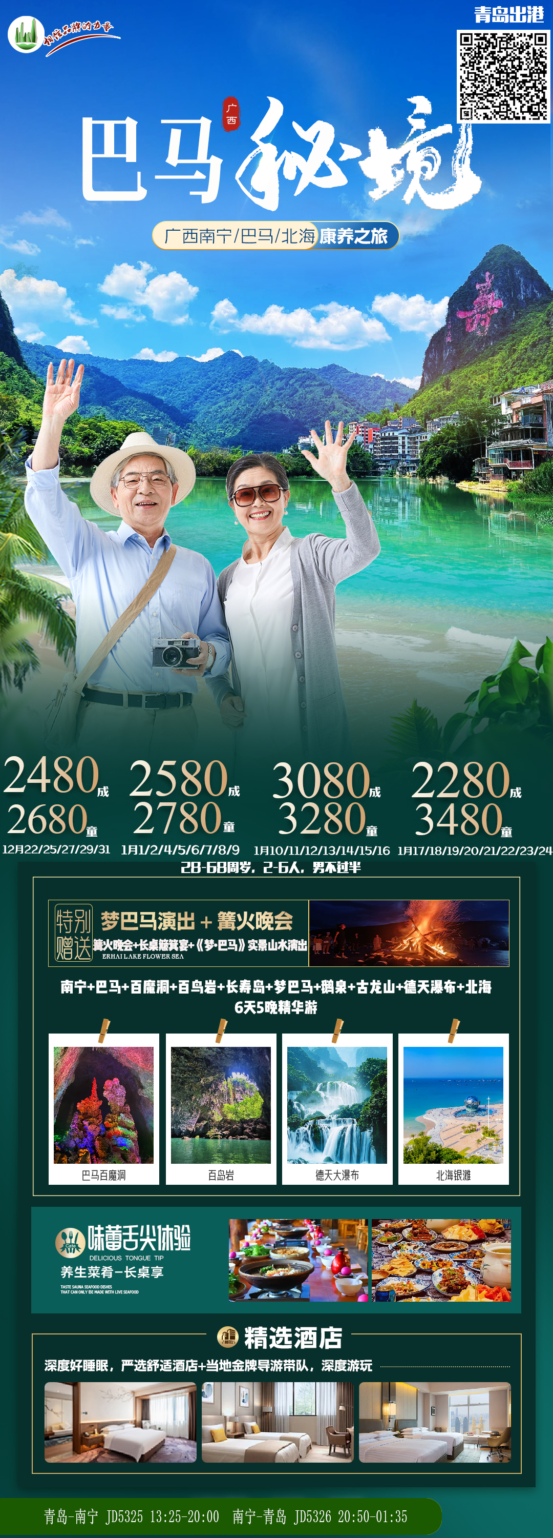 D2 | 南宁Ø巴马Ø百魔洞Ø百鸟岩Ø长寿岛Ø赠送梦巴马晚会 | √ | √ | √ | 巴马/百色 |