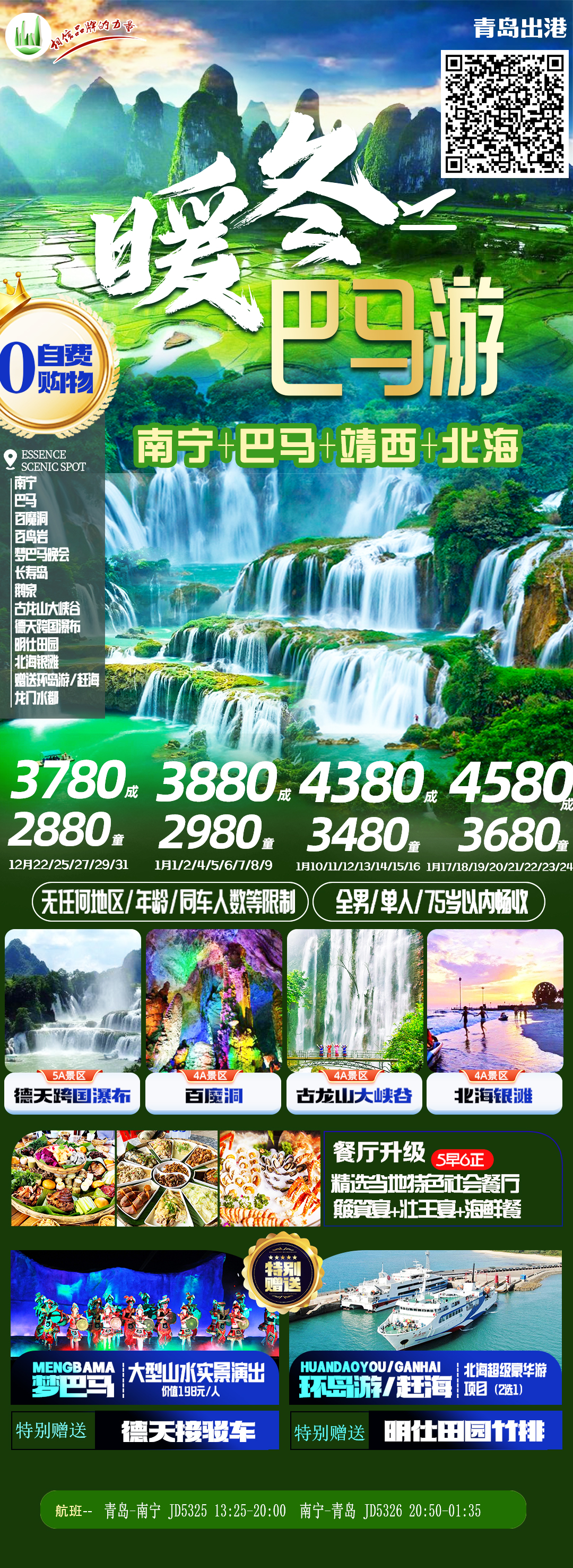 D4 | 德天跨国瀑布Ø明仕田园(赠送竹排)Ø北海 | √ | √ | × | 北海/钦州 |