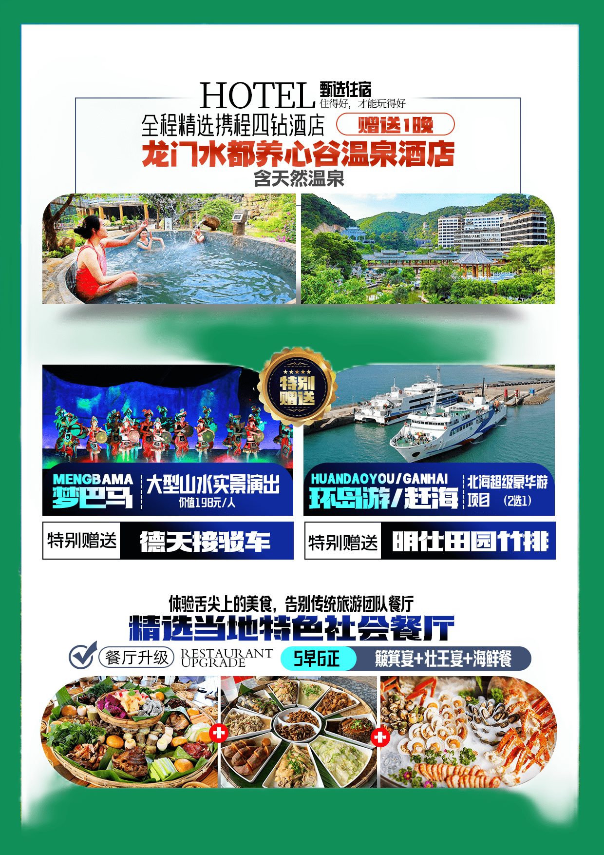 赠送:北海超级豪华游项目【环岛游】或【赶海】(二选一,由导游根据情况安排任一项目,不接受指定),乘观光游船出海,与大海来个亲密接触,途经“海上丝绸之路”北海老港、极具本土文化的地角渔村,海上“蒙古包”——海洋牧蚝场、外沙海鲜岛、北海军港、红帆海滨、北海深水港、海角孤峰——冠头岭(北岭,此一带常有国家一级保护动物白海豚出没)、海上牧区——沙占鱼钓鱼场、海上人家,在船上可免费享受:海上垂钓、水果、自助烧烤、卡拉OK、各式棋类及麻将使用、望远镜眺海。(温馨提示:1.遇台风天气无法出海的,则安排【世外桃园大江埠】,2.赠送项目不参加无退费,敬请知晓!)
