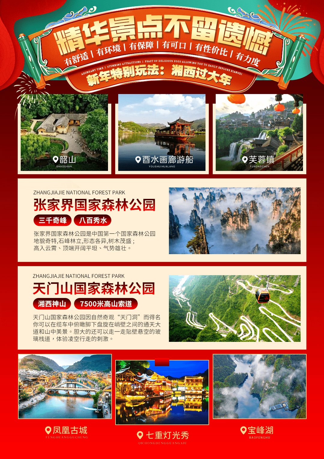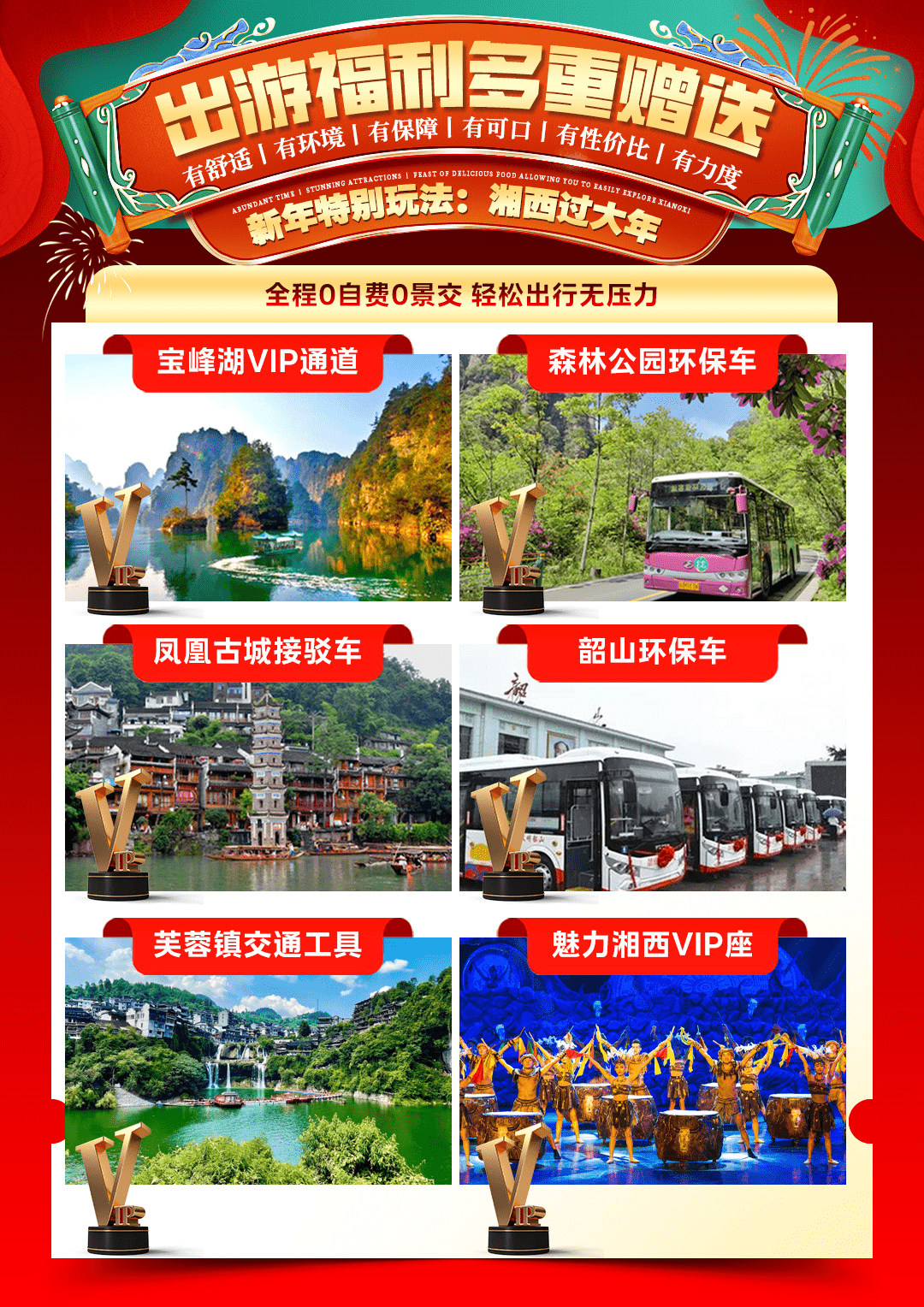 1、门票:森林公园、天门山,芙蓉镇,宝峰湖,电梯单程,索道单程,韶山环保车,魅力湘西,凤凰接驳车已含