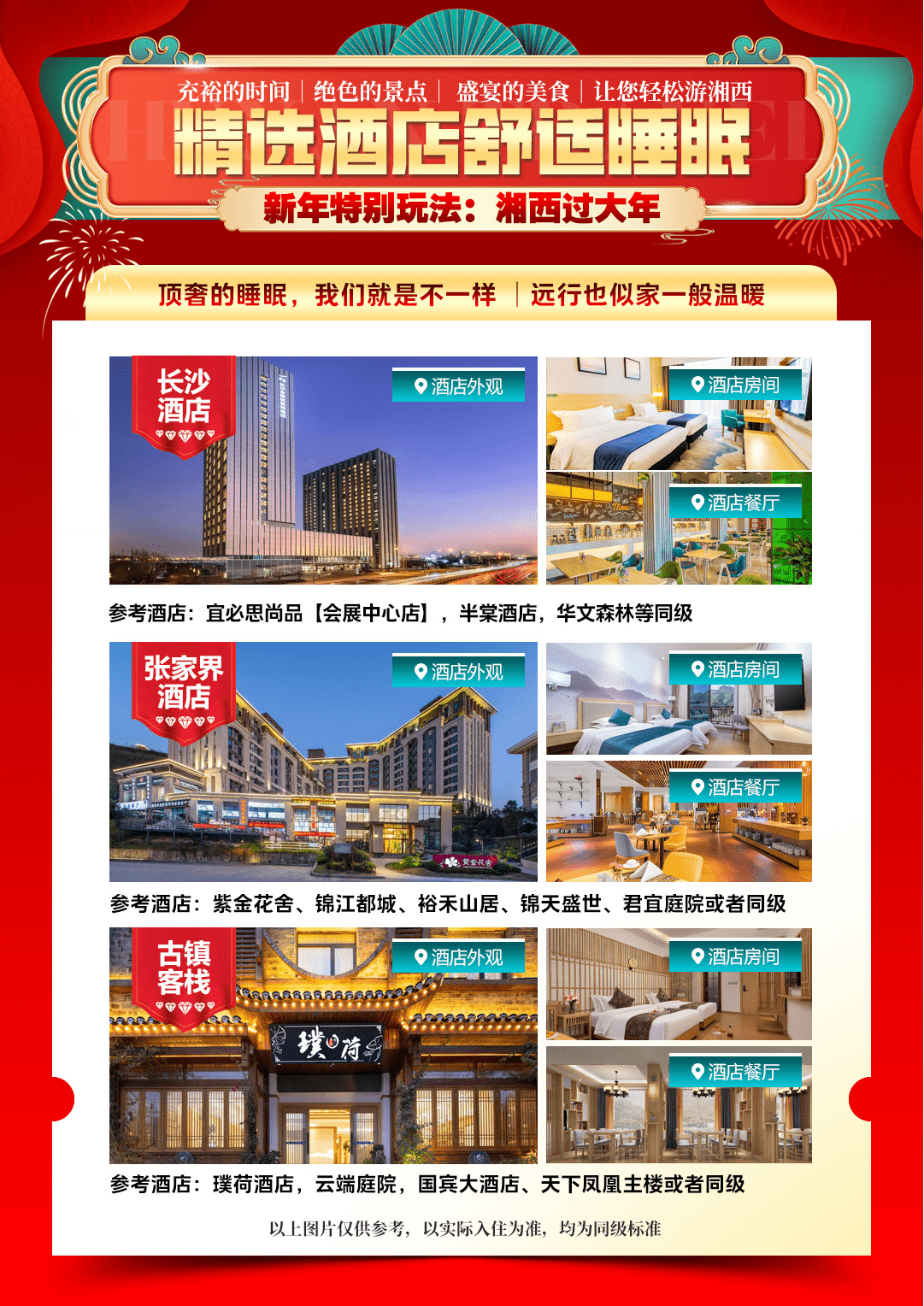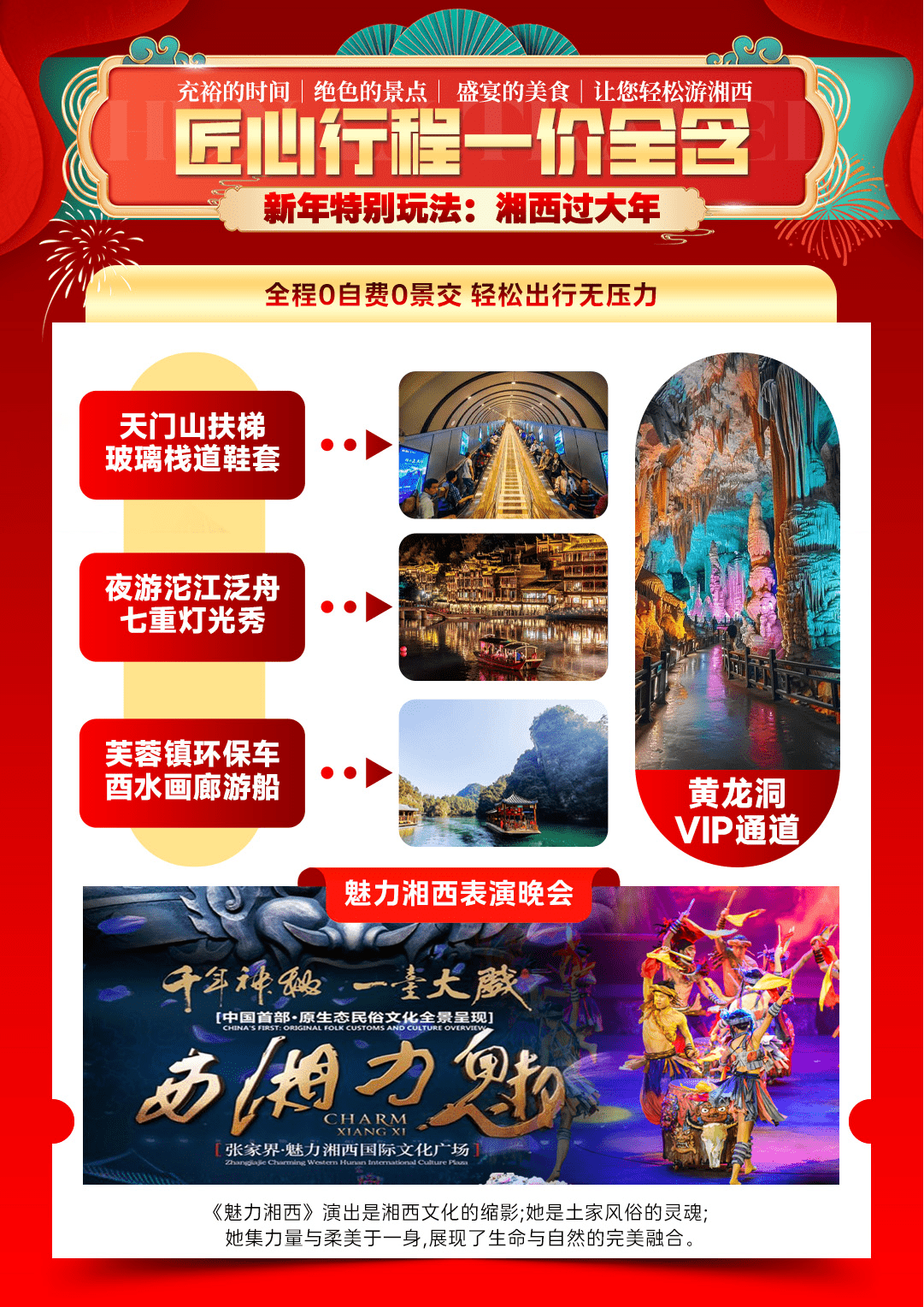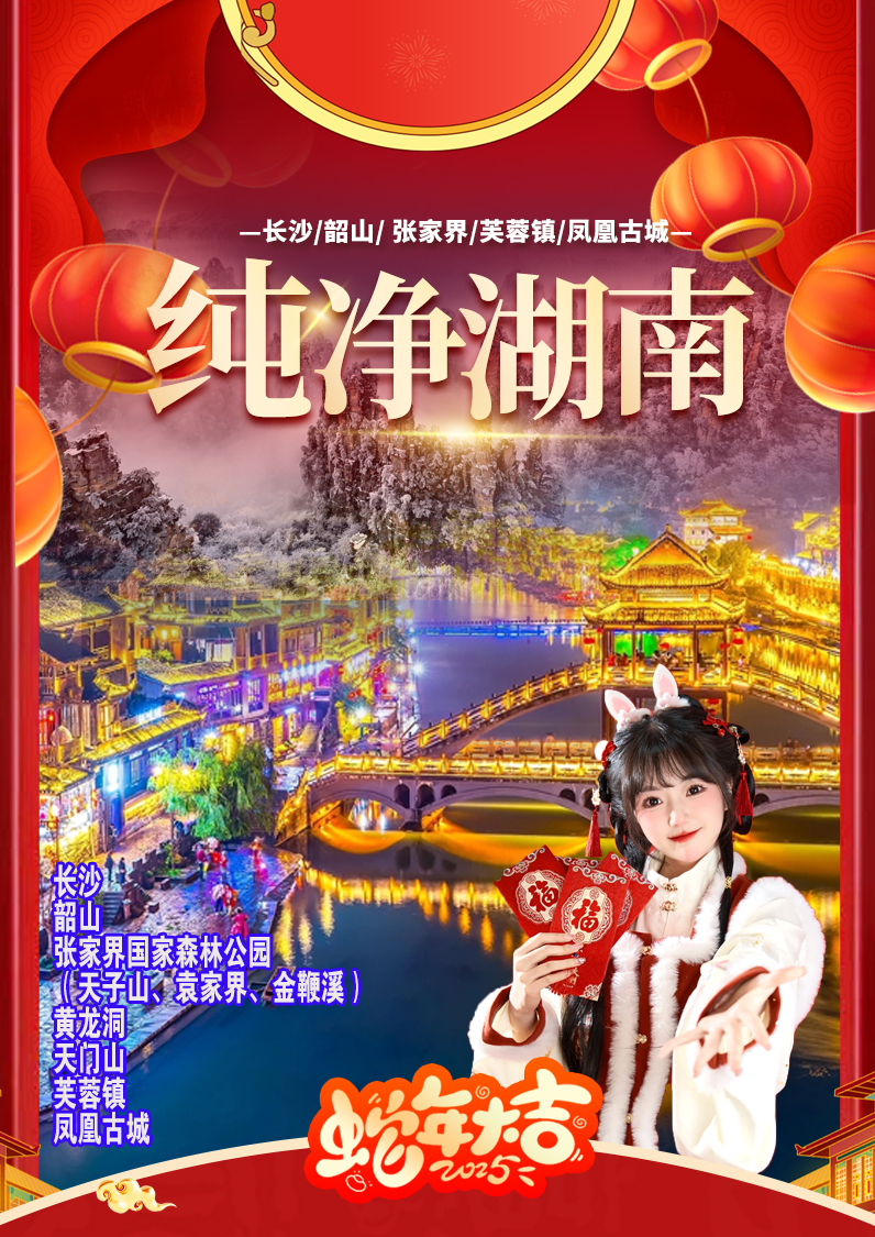 春节【纯净湖南】长沙/韶山/凤凰古城(沱江泛舟)芙蓉镇/晚会/张家界国家森林公园/天子山/袁家界/金鞭溪/黄龙洞/地下游船/土司府/天门山国家森林公园/玻璃栈道6日游