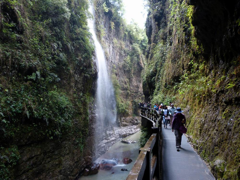 行走悬崖绝壁,河流急湍、悬瀑飞溅,景观环境壮观优越。地缝两侧绝壁陡峭,一道道瀑布飞泻直下,缝底云龙河潺潺淌过,水质清澈见底,缝壁茂密的灌木相互掩映,斑斑阳光洒入缝中,以险、俊、奇、幽的自然景象、峰丛、峡谷栈道、千层岩、绝壁等~!(小蛮腰观光垂直电梯30元自愿自理);