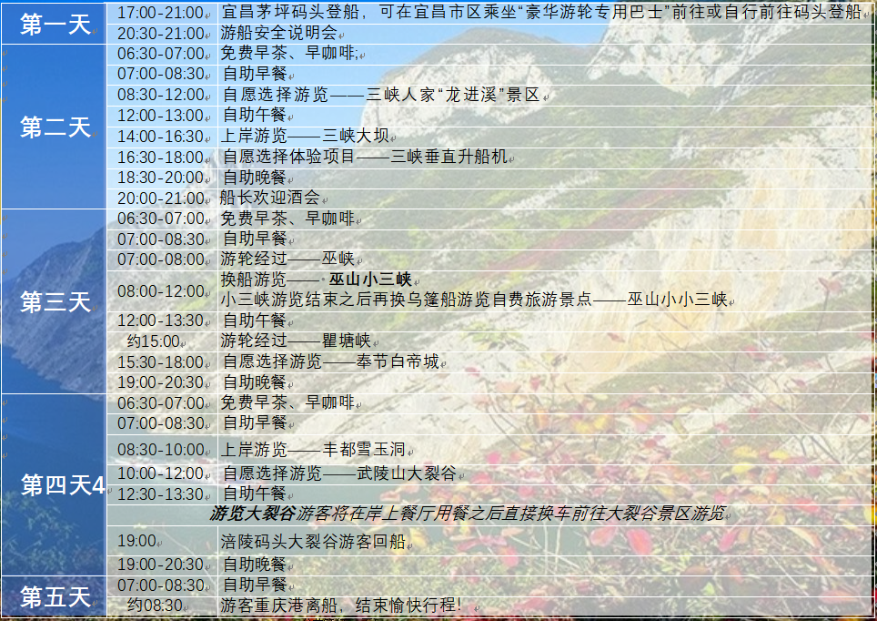 4、 用餐:行程所列游轮自助餐(登船当日不含餐)。