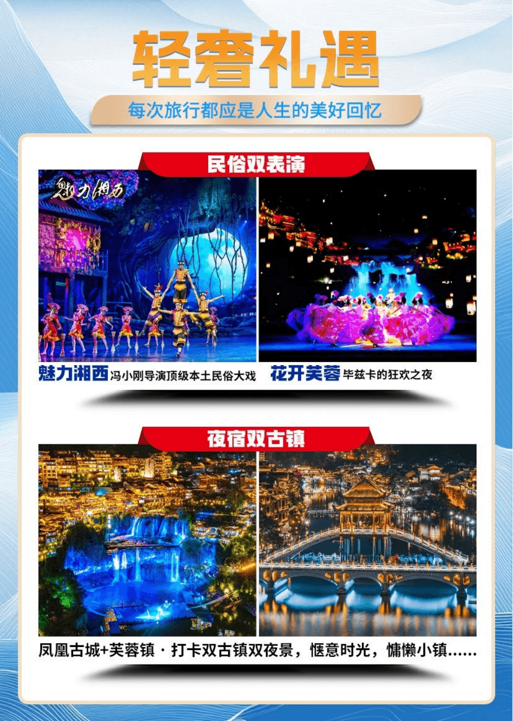 晚上前往观赏大型民俗表演:【魅力湘西】或【千古情】(赠送晚会,不去不退亦不做等价交换);观赏非物质文化演艺经典,让您在惊奇、兴奋中了解湘西,湘西不再神秘!