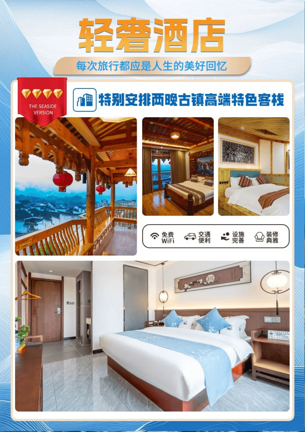 2、酒店:全程入住四钻酒店+凤凰古城/芙蓉镇民宿客栈或酒店