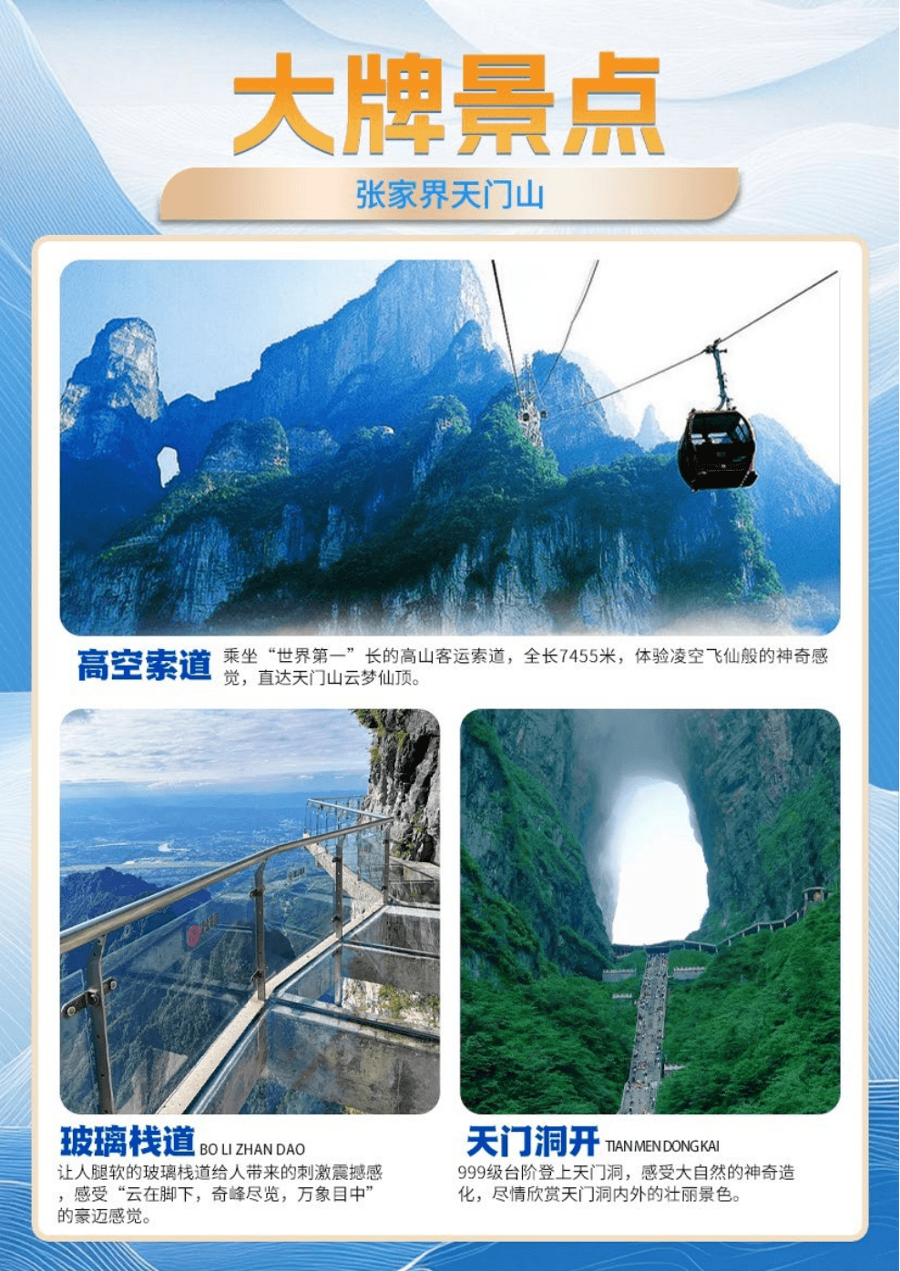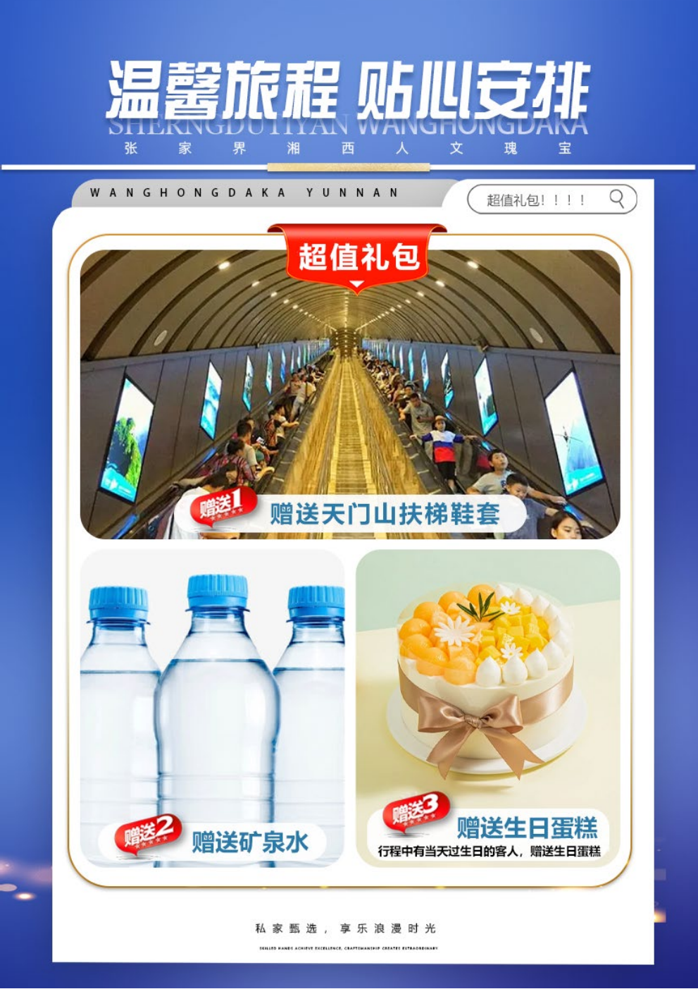1 、 张家界森林公园门天门山门票;赠送张家界千古情晚会 ,天门山穿山扶梯+鞋套;赠送土司城;赠送凤凰 古城旅游接驳车;百龙电梯;苗寨(此行程门票无任何退费)。