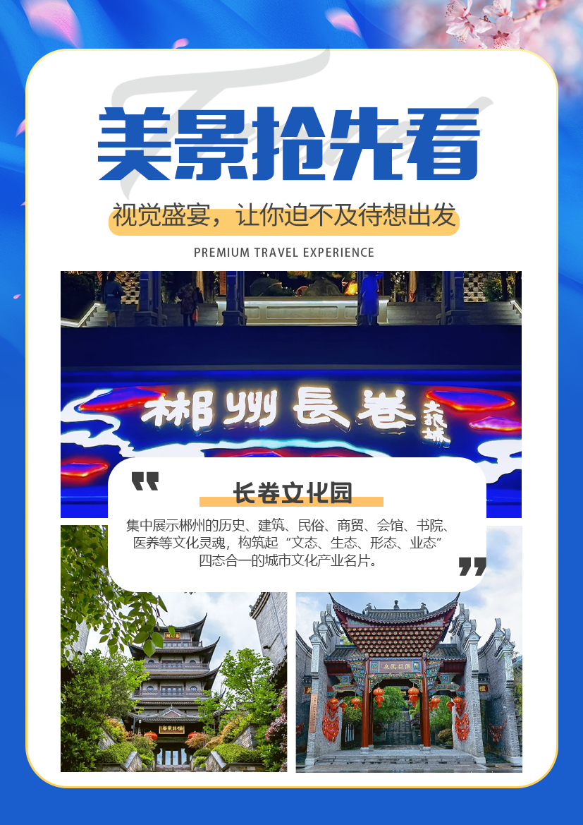 参观【长卷文化园】,项目占地约500亩,总投资23亿元,建筑面积约24万平方米,提取郴州十一个县市区的古建筑元素,集中展示郴州的历史、建筑、民俗、商贸、会馆、书院、医养等文化灵魂,构筑起“文态、生态、形态、业态”四态合一的城市文化产业名片。