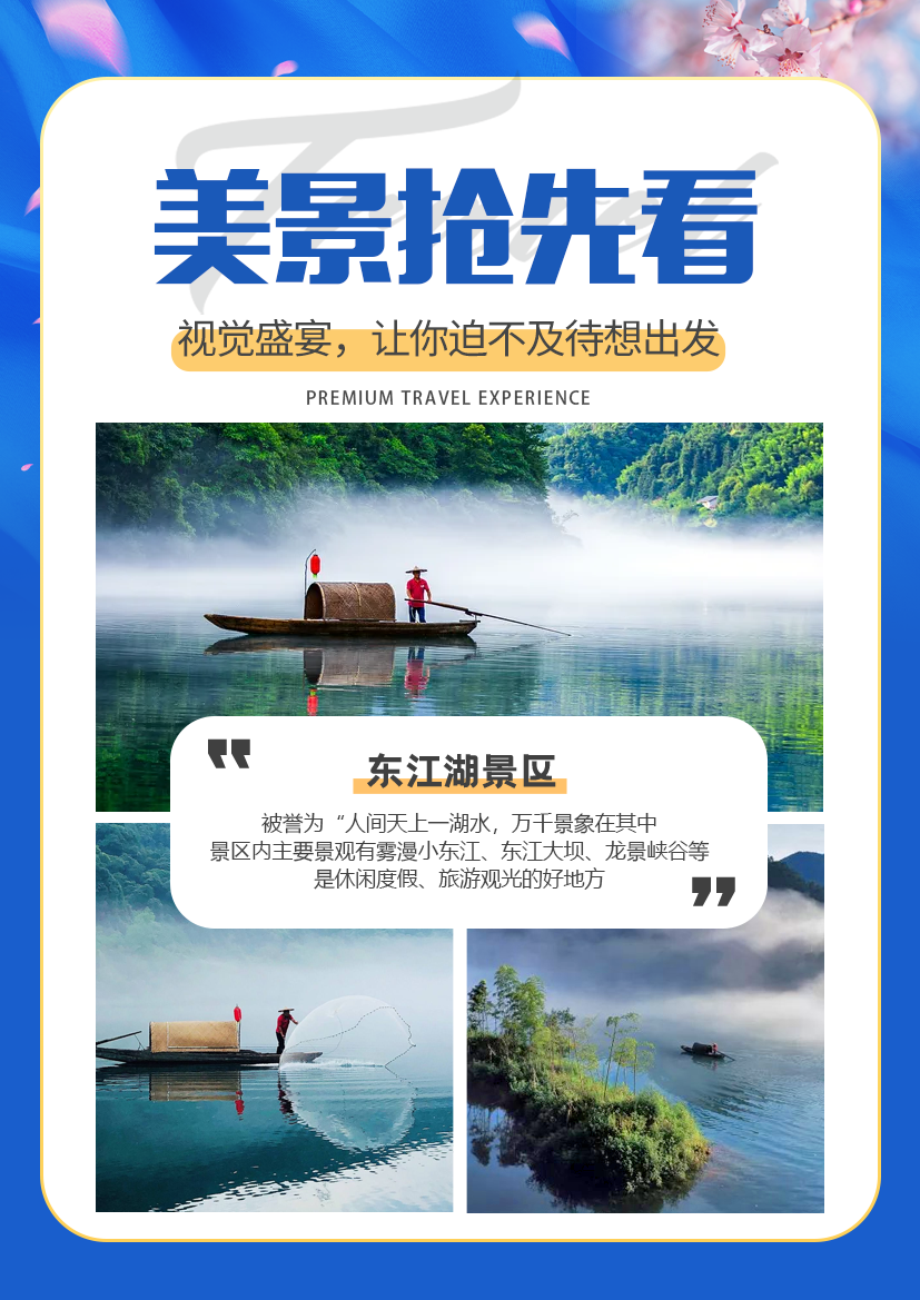 早餐后游览 5A 级旅游景区-【东江湖风景区】。坐景区车前往摄影发烧友的最佳拍摄地【雾漫小东江】,沿江边栈道徒步慢游,偶遇雾漫美景,留足充分拍照时间。这里常年两岸峰峦叠翠,土房、红叶、白云等自然景观形 成倒影,美丽绝伦湖面水汽蒸腾,云雾缭绕,神秘绮丽,其雾时移时凝,宛如一条被仙女挥舞着的“白练”美丽之极,堪称中华一绝。观赏雾漫小东江后车观【猴古山瀑布】中国自行设计施工的第一座双曲薄壳高拱坝,在世界同类型大坝中 名列第三、亚洲第二的【东江大坝】。抵达东江大坝后游览【龙井峡谷瀑布群】。沿途可以观赏到烟竹山瀑布、龙景瀑龙吟瀑、三叠瀑、龙卷瀑、鸳鸯瀑等形态各异的瀑布和古松坳、连理树、龙鳞石等千姿百态的景点。