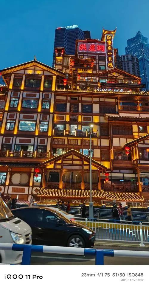 欣赏夜景国家AAAA级旅游景区【洪崖洞】原名洪崖门,是古重庆城门之一,位于重庆市渝中区嘉陵江滨江路88号,2003年,总投资3.85亿元对洪崖洞片区进行旧城拆迁改造,于2006年9月竣工开业,是兼具观光旅游、休闲度假等功能的旅游区。洪崖洞是重庆市重点景观工程,建筑面积4.6万平方米,主要景点由吊脚楼、仿古商业街等景观组成 。洪崖洞一共有11层,夜晚灯光从晚上6点开灯,10点熄灯。可望吊脚群楼观洪崖滴翠,逛山城老街赏巴渝文化,烫山城火锅看两江汇流,品天下美食。形成了“一态、三绝、四街、八景”的经营形态,体现了巴渝文化休闲业态。