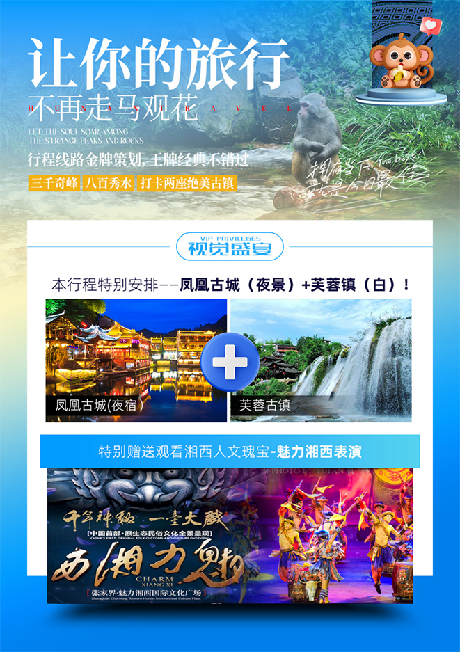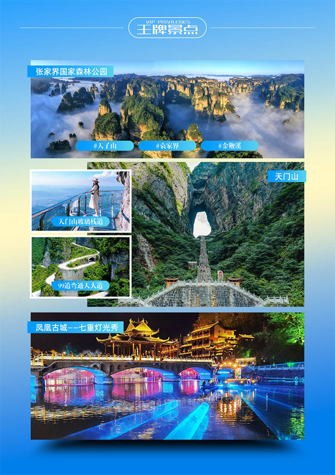 行程景点: 四个5A景区:张家界森林公园深度游览、天门山森林公园·玻璃栈道、韶山、凤凰古城、两个4A景区:芙蓉古镇、黄龙洞景区